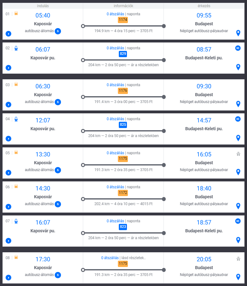 | Indulás: Kaposvári Egyetem megálló | Járatszám | Menetidő (perc) | Érkezés: Helyi autóbusz-állomás |
