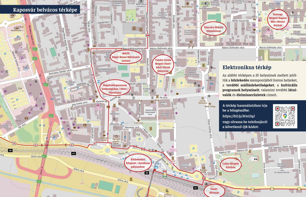 A térképen a fő helyszínek mellett jelöltük a közlekedés szempontjából fontos helyeket, a további szálláslehetőségeket, a kultúrális programok helyszíneit, valamint további látnivalók és élelmiszerüzletek címeit.
